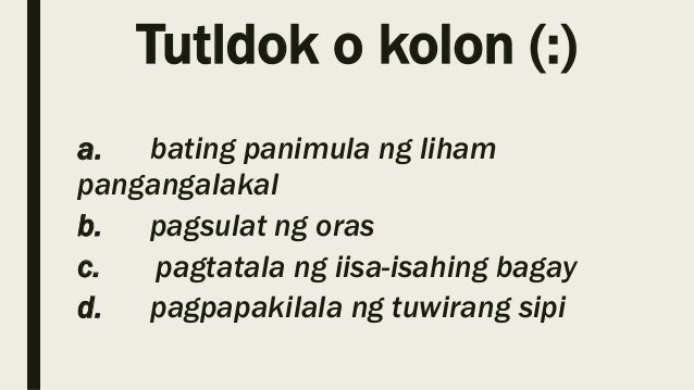 Maaaring gumamit ng tuldukuwit sa halip na tutuldok sa katapusan ng bating panimula ng liham pangalakal. Save Save Filipino 1 Paglalagay Ng Wastong Bantas For Later. PANAKLONG - Ang mga panaklong ay ginagamit na pambukod sa salita o mga salitang hindi direktang kaugnay ng diwa ng pangungusap gaya ng mga ginamit sa pangu-ngusap na ito.